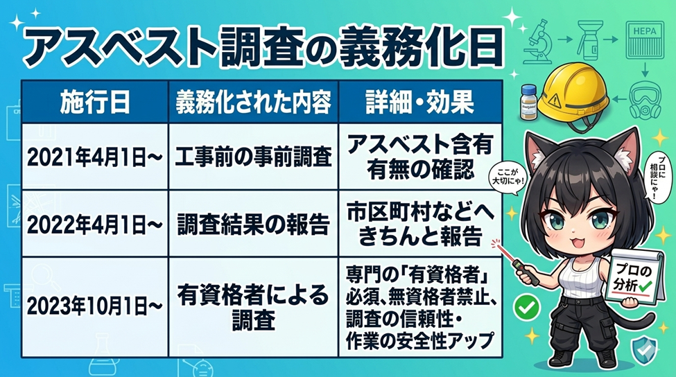 アスベストの被害を防ぐため、建物を壊したり直したりする前には、アスベストが含まれているかどうかを調べる「事前調査」が義務付けられています 。この義務化は段階的に強化されてきました。