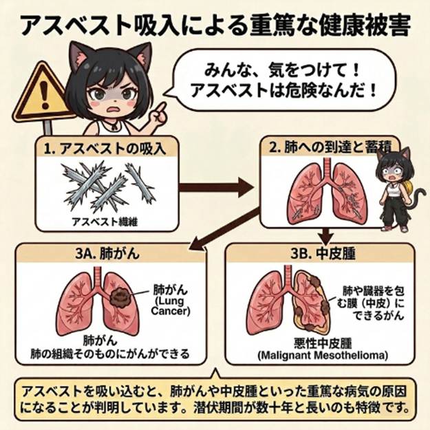 昔の建物には、アスベストが大量に使用されていました 。しかし、アスベストを吸い込むと肺がんや中皮腫といった重篤な病気の原因になることが判明しています 。そのため現在では使用が禁止されていますが、過去に建てられた建物にはまだ残っていることが多いのが現状です 。